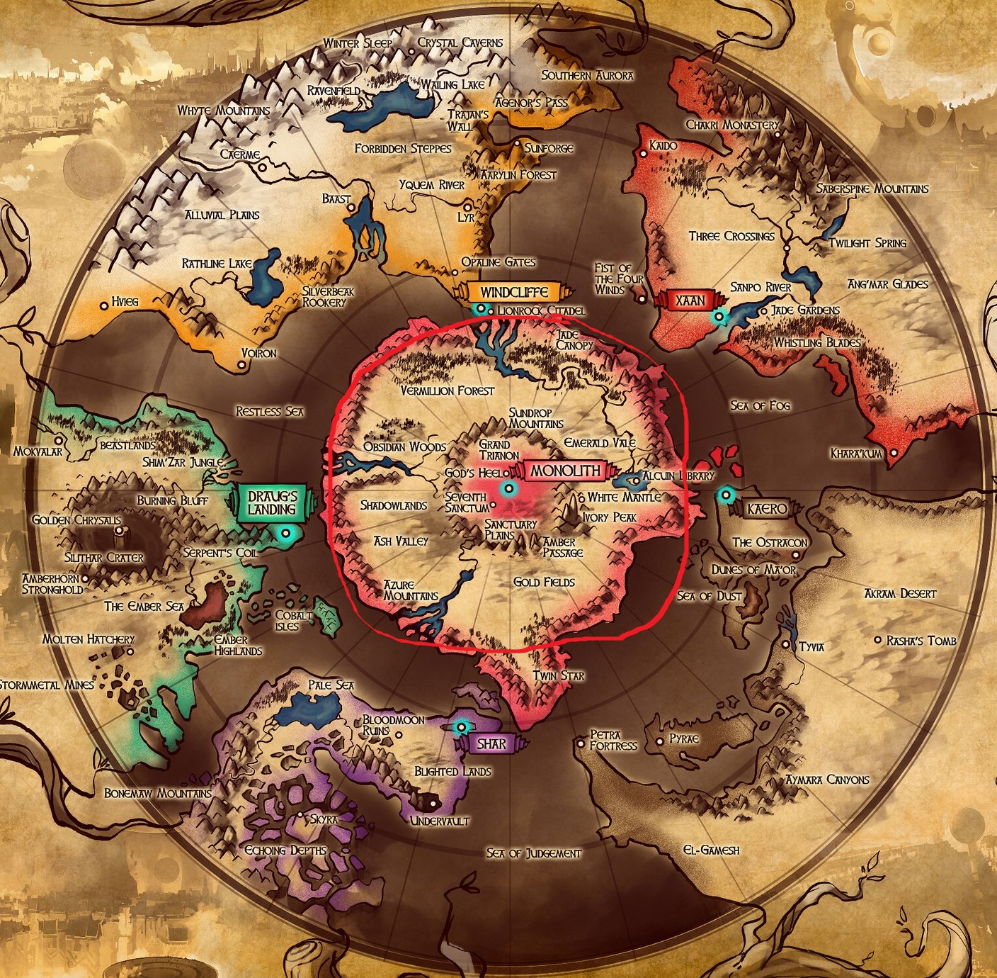 広大で温暖な①Celandine大陸は後のLynor Kingdomsの本拠地に、草の生い茂る危険に満ち溢れたXenkhai大陸は後の②Songhai Empireの本拠地に、不毛で荒れ果てた➂Akram大陸は後の④Vetruvian Imperiumの本拠地に、砕けて粉々になった大地の割れ目のStyxusは後の➄Abyssian Hostの本拠地に、原生的な火山のあるMagaari大陸は後のMagmar Aspectsの本拠地に、遥か遠くのWhyte山脈にまたがる⑥Halcyarは後のVanar Kindredの本拠地になった。